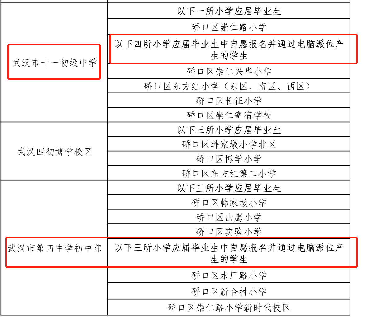 其中,十一初除了招收崇仁路小学的毕业生外,周边的崇仁兴华小学、长征小学、东方红小学、硚口区崇仁寄宿学校4所小学毕业生也可自愿报名,通过电脑派位升入十一初。