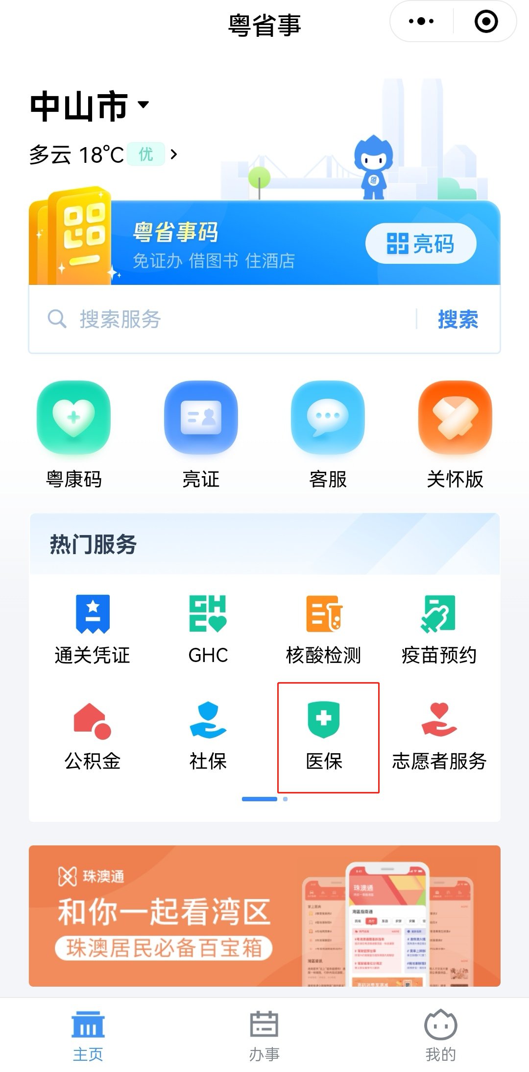 1、打开“粤省事”微信小程序→登录→“服务”→医保;