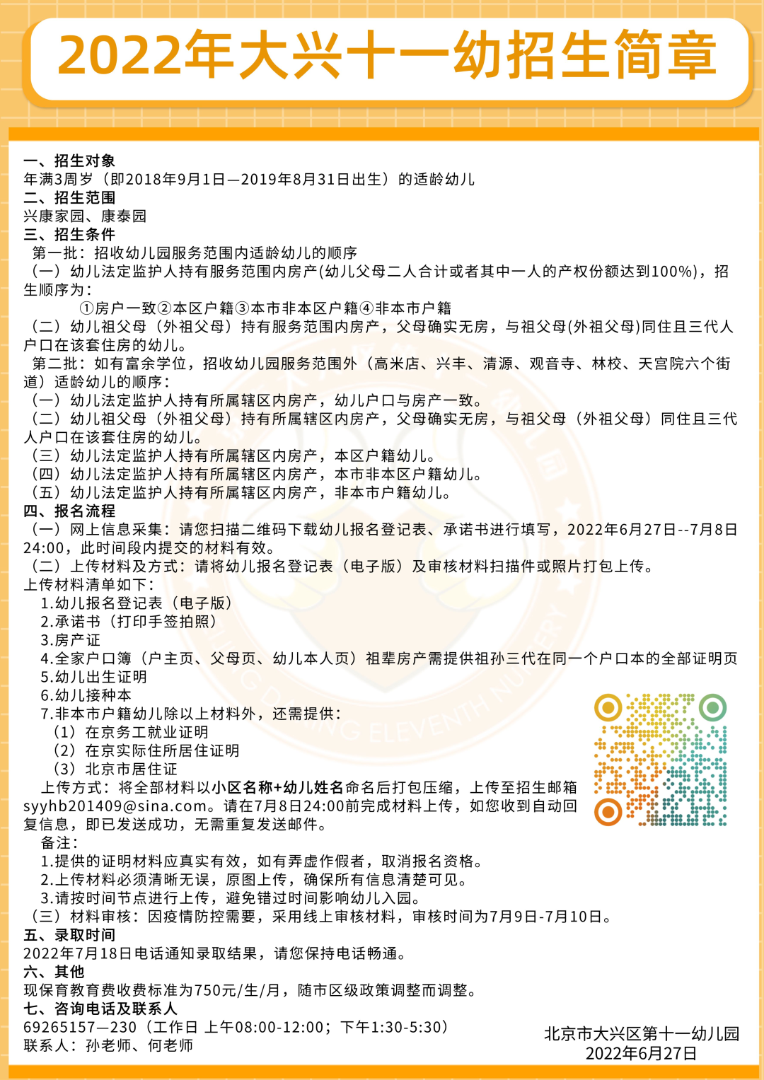(一)网上信息采集:请您扫描二维码下载幼儿报名登记表、承诺书进行填写,2022年6月27日--7月8日24:00,此时间段内提交的材料有效。