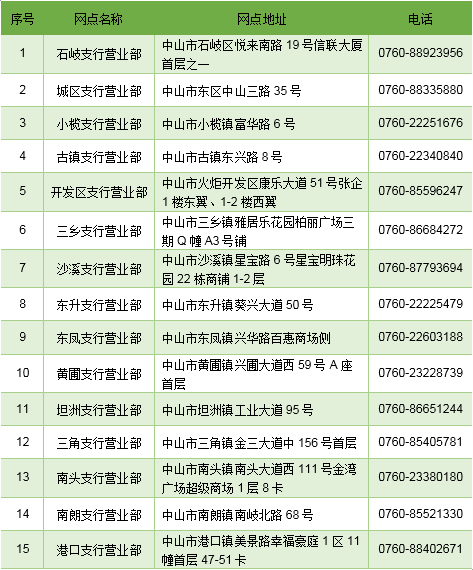农业银行中山分行营业网点信息