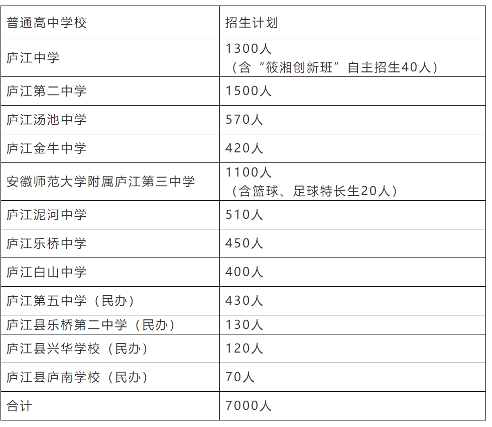 2022年庐江县普通高中招生计划