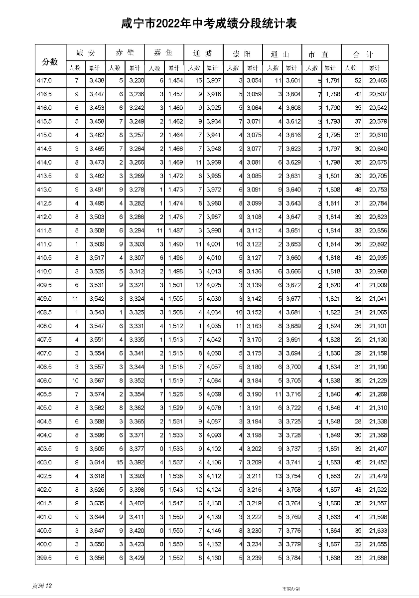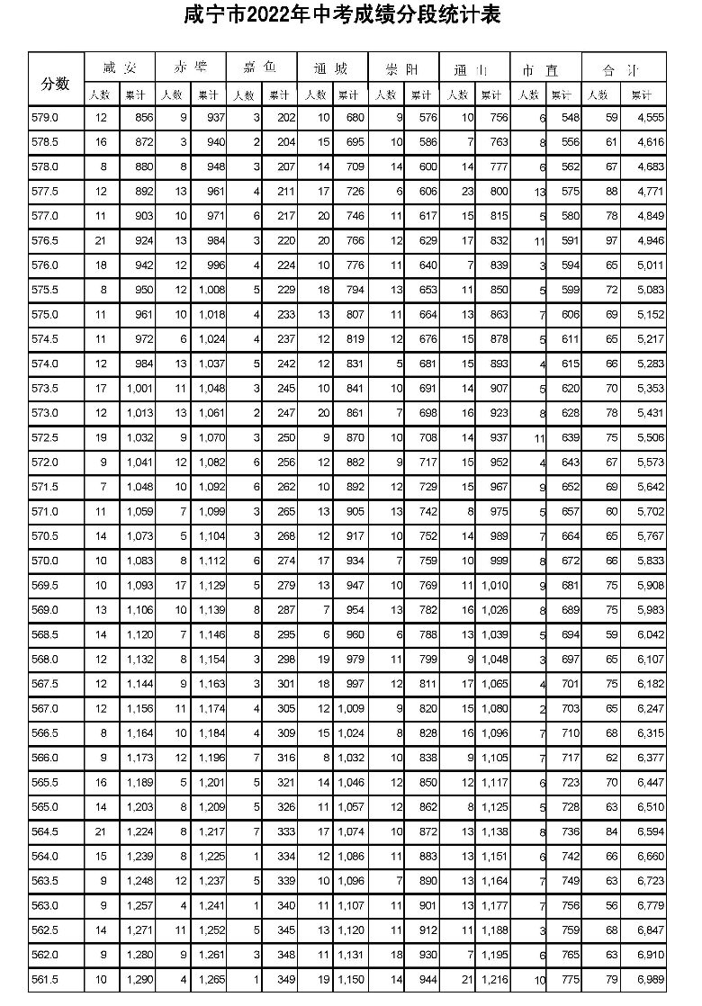 2022年咸宁市中考成绩一分一段统计表