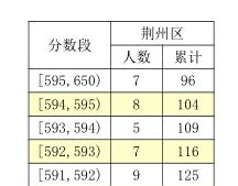 以荆州区2021年中考成绩一分一段表为例,第一行“[595,650),7,96”指荆州区中考成绩为595分的考生有7人,595分及以上的考生累计有96人;第二行“[594,595),8,104”指荆州区中考成绩为594分的考生有8人,594分及以上的考生累计有104人。
