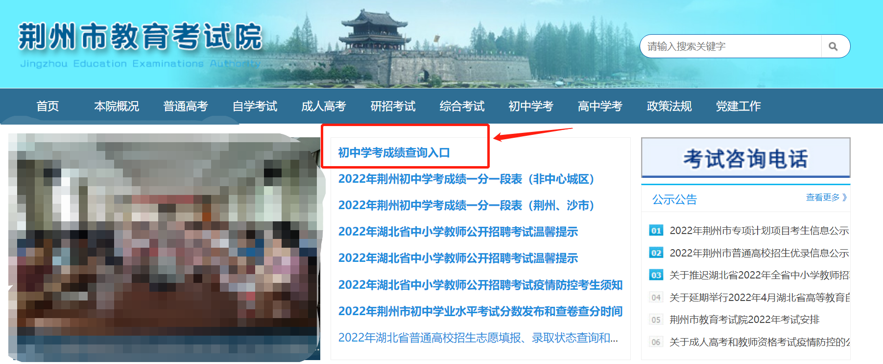 1、进入荆州市教育考试院官网,首页找到“初中学考成绩查询入口”并点击进入;