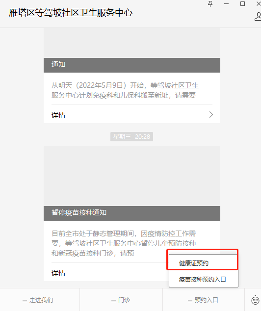 1.关注”雁塔区等驾坡社区卫生服务中心”公众号,点击预约入口,健康证体检,进入健康体检预约平台,填写信息。