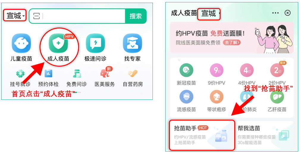 2、选择“宣城”地区,点击医鹿App首页“成人疫苗” ,进入页面后再点击“抢苗助手”进入抢苗助手页面,点击“开启订阅”即可收到预约通知