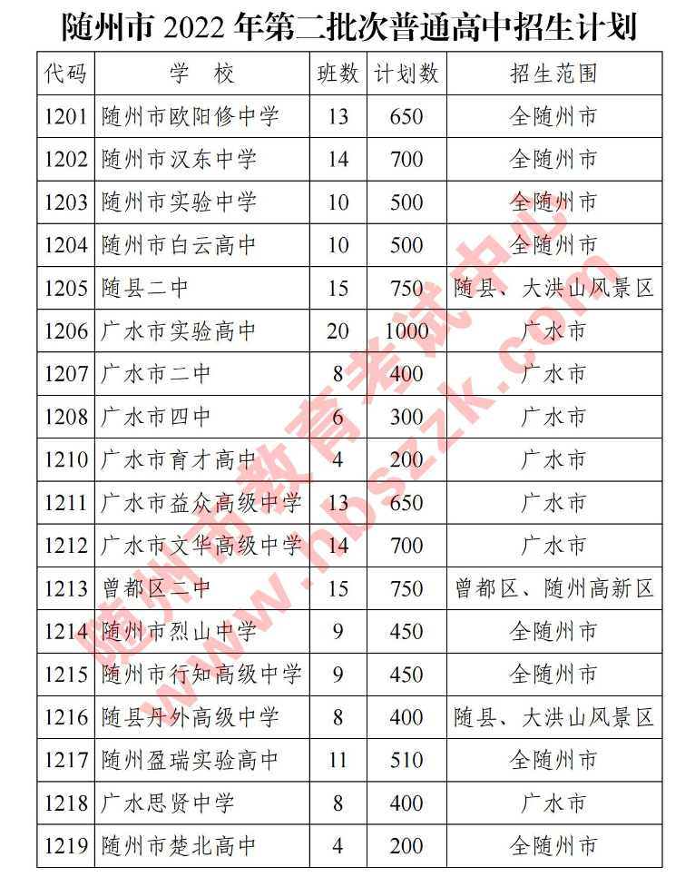 (一)2022年随州中考第一批次学校名额分配招生、体艺特长生录取后剩余计划