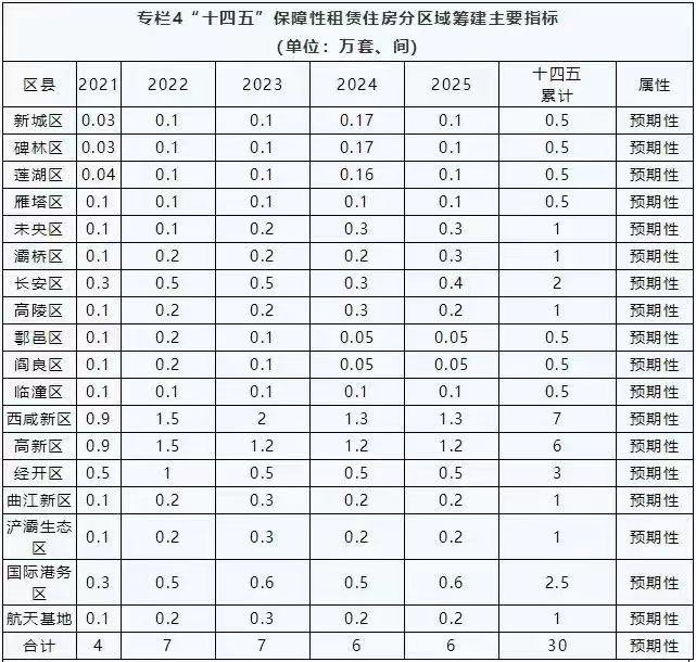 西安目前保障性租赁住房处于建设初期阶段,截止到2025年,西安建设筹集保障性租赁住房30万套(间),总建筑面积约2470万平方米。