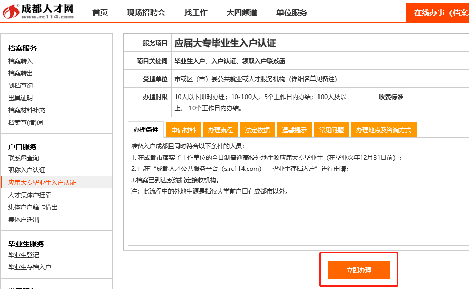 ②进入“应届大专毕业生入户认证”页面点击“立即办理”开始申请