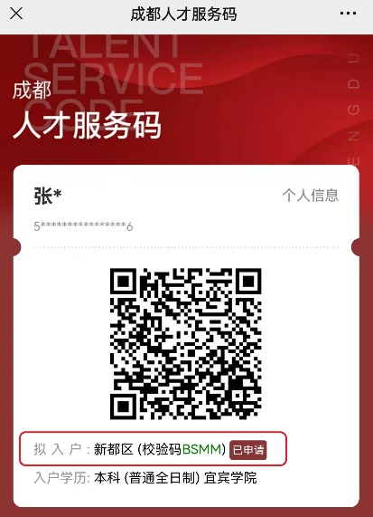 人才服务码生成后,持码到拟入户地公安办证中心现场或“成都公安微户政”申请办理户籍迁移。