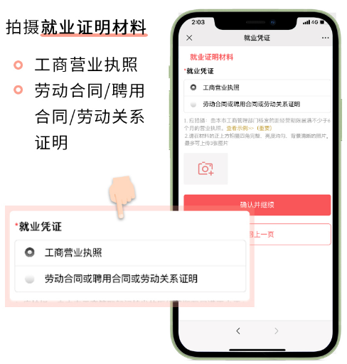 需要拍摄就业证明材料(工商营业执照或劳动合同聘用合同劳动关系证明),