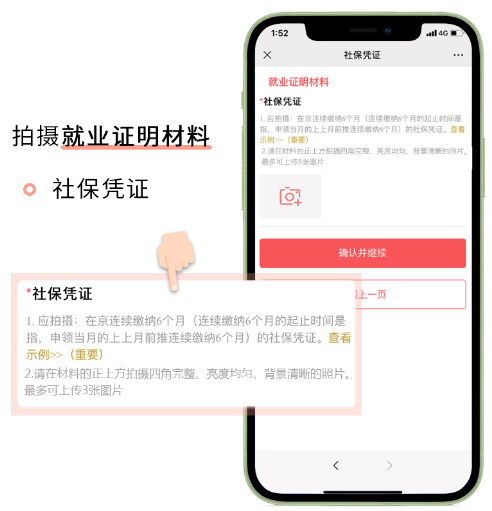 类型三:选择“在京连续6个月缴纳社保(含三险:工伤、失业、养老)”作为居住时间证明,需要拍摄就业证明材料(社保凭证),