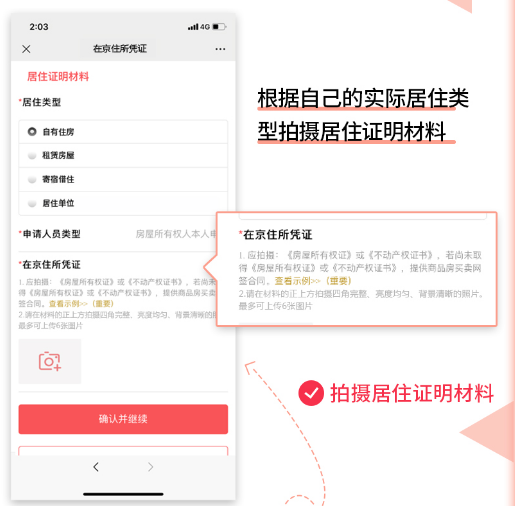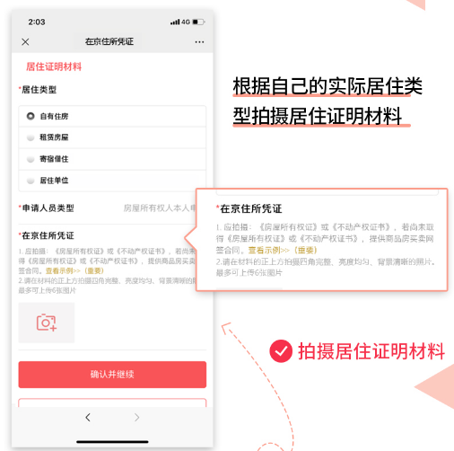 类型四:选择“持有有效期内的《北京市工作居住证》”作为居住时间证明,需要拍摄就业证明材料(工作居住证),