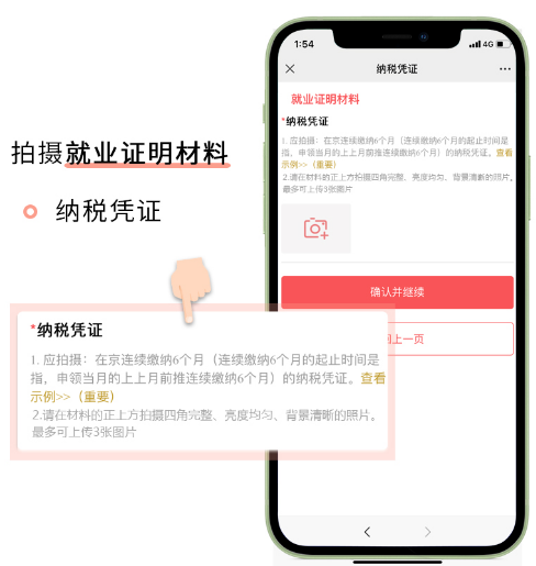 类型二:选择“在京连续6个月缴纳个人工资薪金所得税”作为居住时间证明,需要拍摄“就业证明材料(纳税凭证)”,