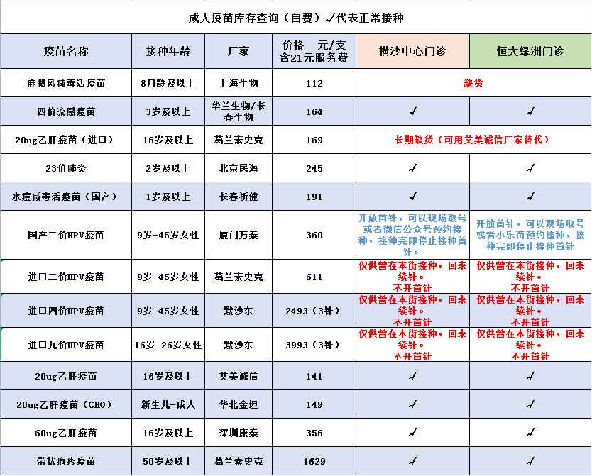 白云区金沙街成人疫苗库存查询(自费)(√代表正常接种)