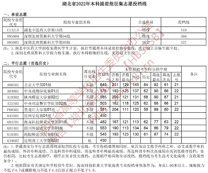 湖北省2022年本科提前批征集志愿投档线