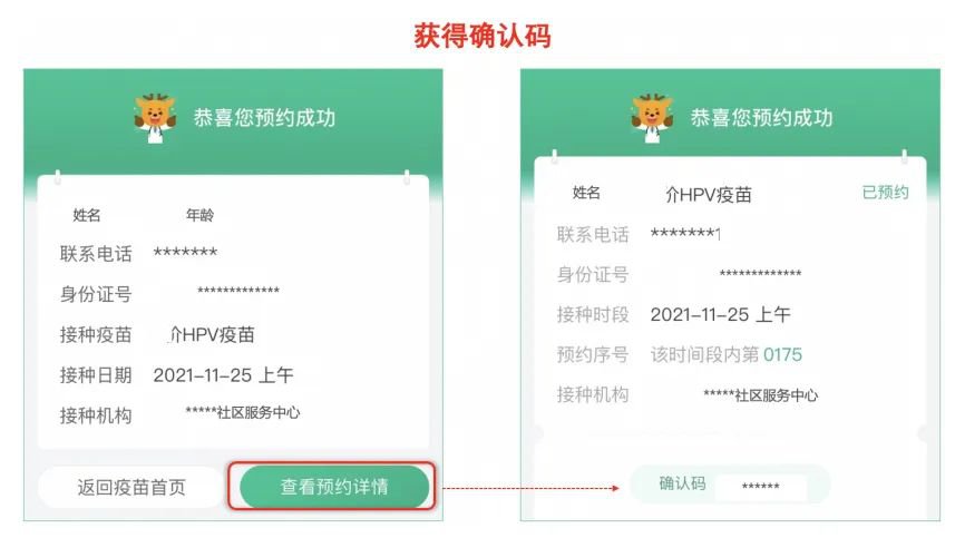 预约成功后,点击“查看预约详情”,获得确认码,之后请携带相关证件,按预约时间准时前往接种点接种。
