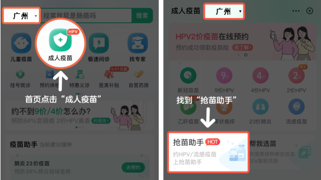 2、选择“广州”地区,点击“成人疫苗”,点击“抢苗助手”。