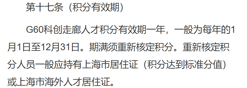 G60科创走廊人才积分有效期一年,一般为每年的1月1日至12月31日。期满须重新核定积分。重新核定积分人员一般应持有上海市居住证(积分达到标准分值)或上海市海外人才居住证。