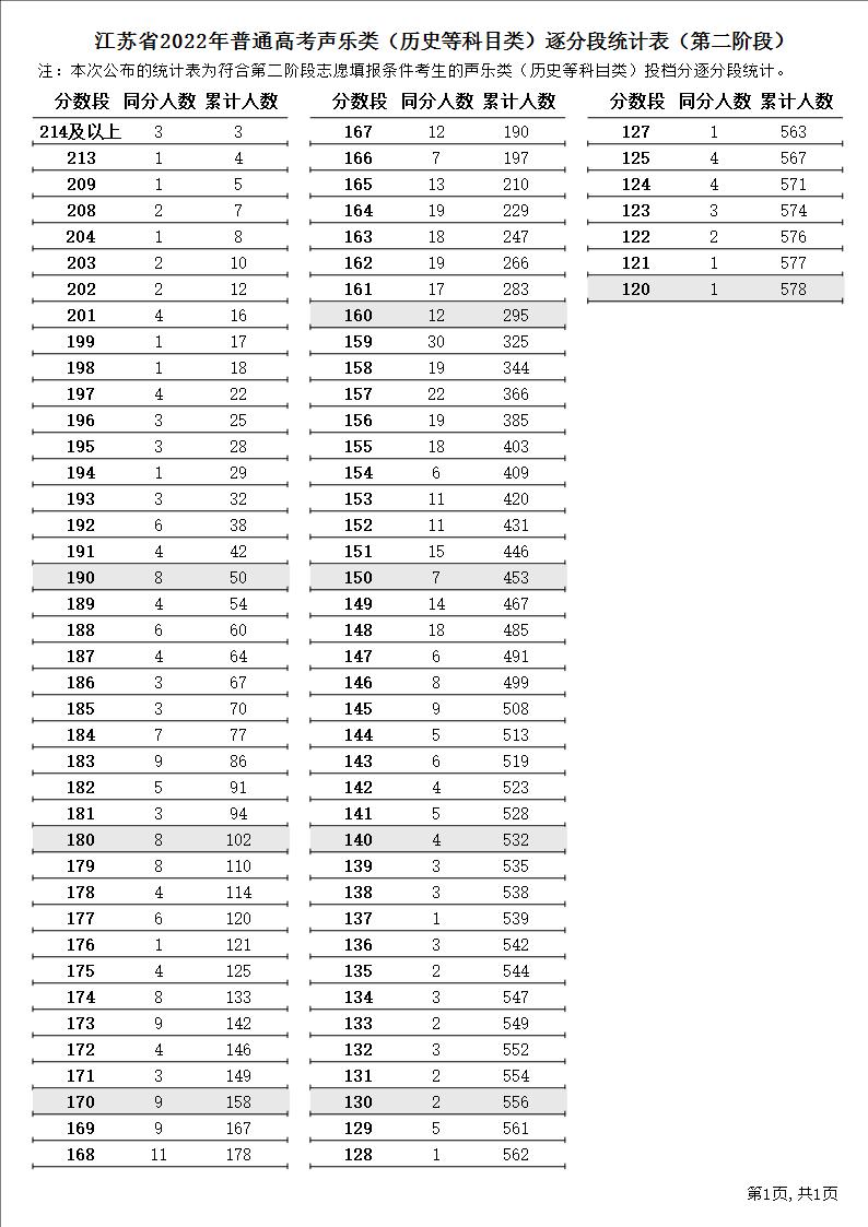 江苏省2022年普通高考声乐类(历史等科目类)逐分段统计表(第二阶段)1