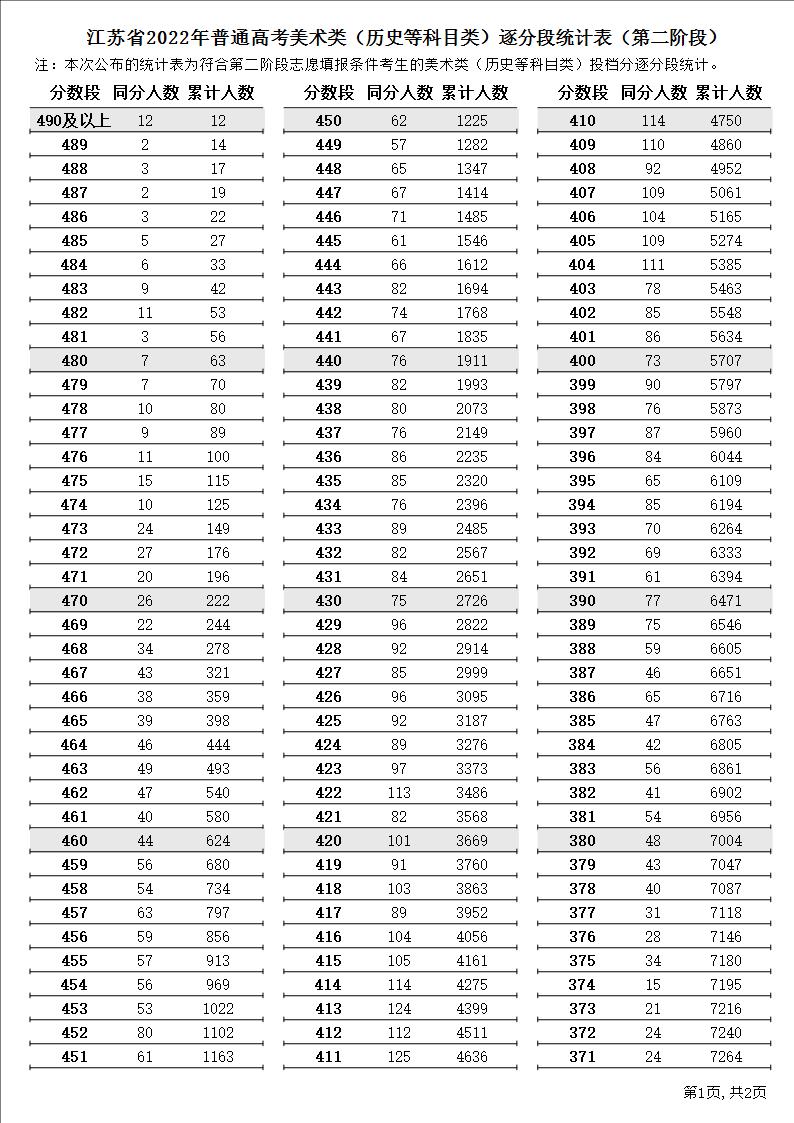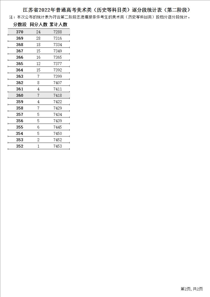 江苏省2022年普通高考美术类(历史等科目类)逐分段统计表(第二阶段)2