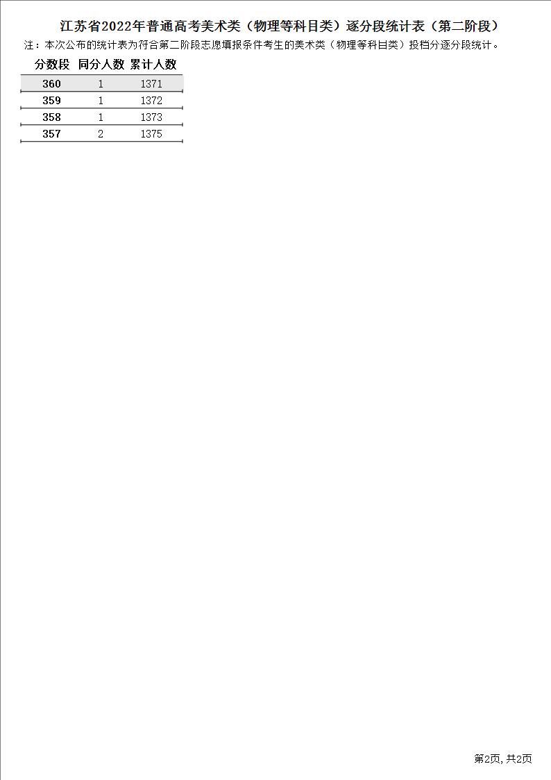 江苏省2022年普通高考美术类(物理等科目类)逐分段统计表(第二阶段)2