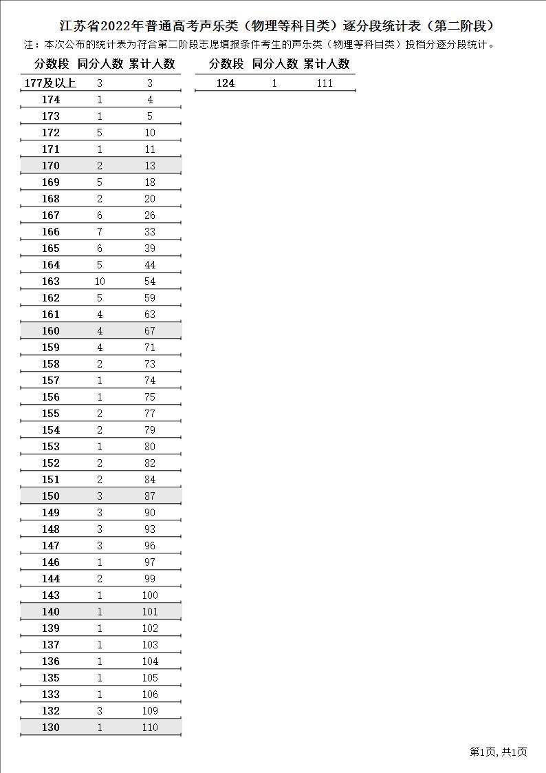 江苏省2022年普通高考声乐类(物理等科目类)逐分段统计表(第二阶段)1