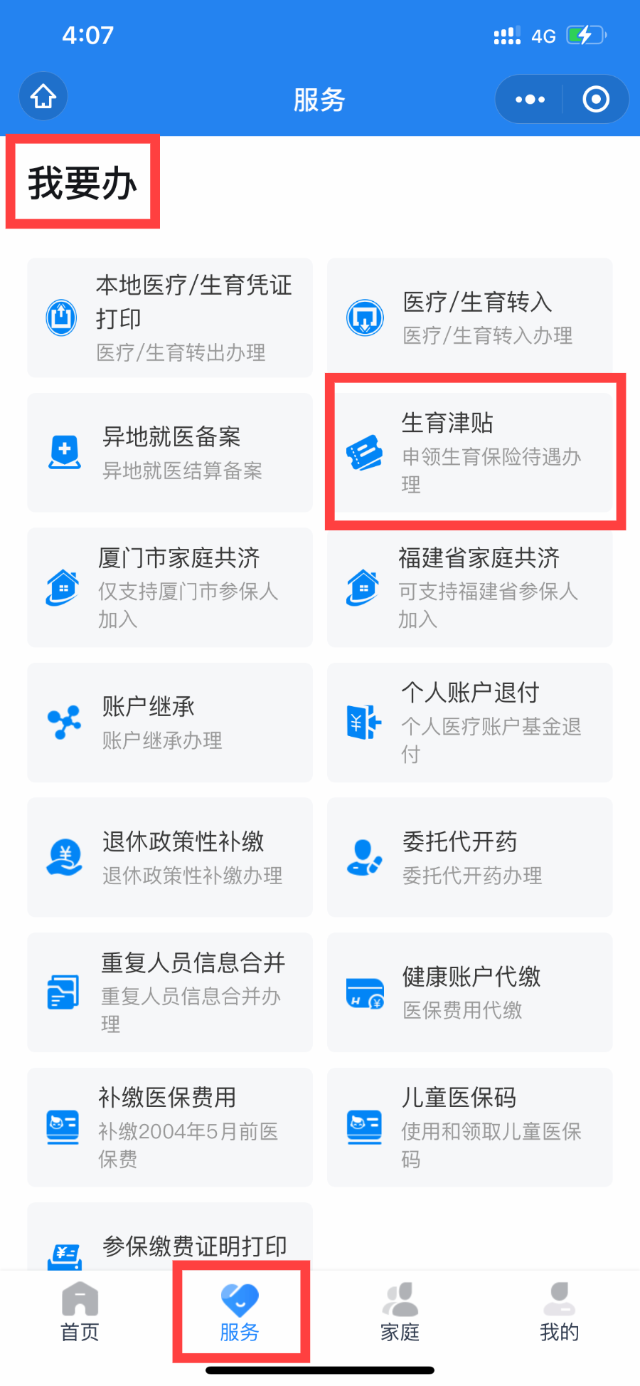 3.点击“服务”模块,找到“我要办”——“生育津贴”,按提示操作即可