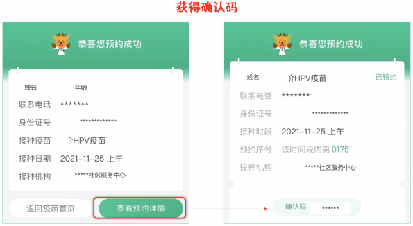 预约成功后,点击“查看预约详情”,获得确认码,之后请携带相关证件,按预约时间准时前往接种点接种。