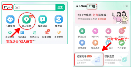 2、下载后,选择“广州”地区,点击“成人疫苗”,点击”抢苗助手“。