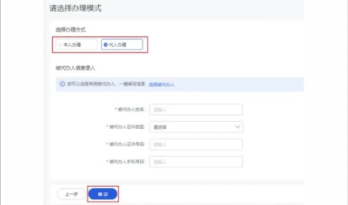 选择办理模式,选择“代人办理”时需填写被代办人信息,点“确定”