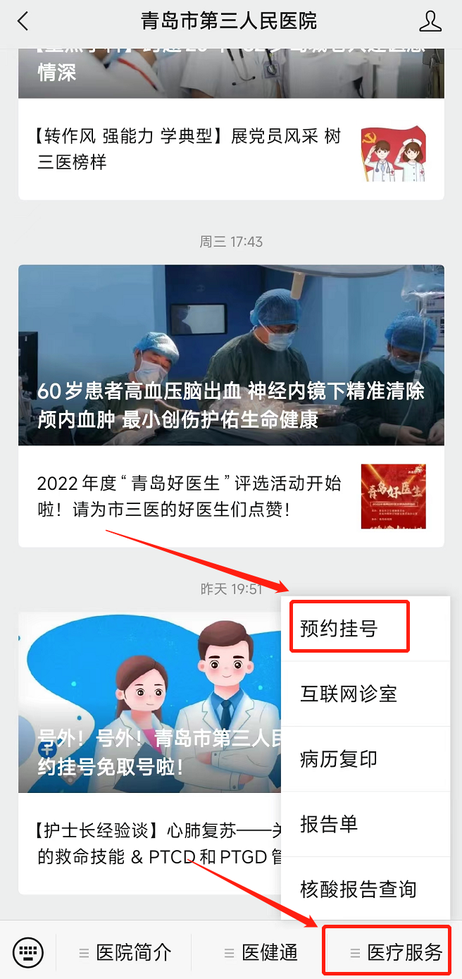 预约入口:【青岛市第三人民医院微信公众号】或者【健康青岛公众号】