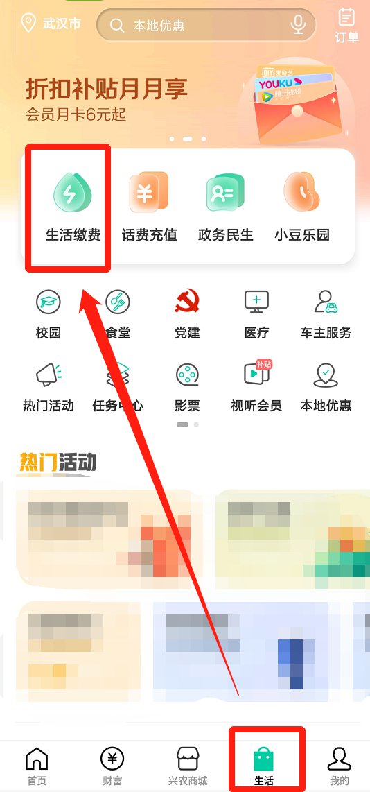 3、首页点击“生活”栏目,选择“生活缴费”;