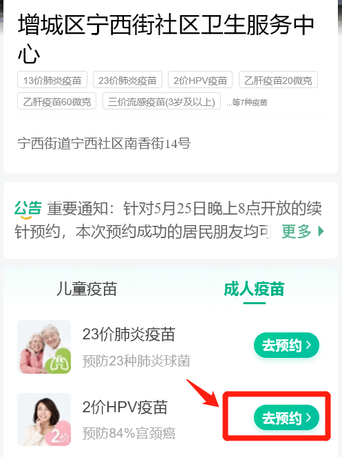 本次预约只限首针,本品与其他HPV疫苗不可以互换使用,预约前请避开月经期。预约好的居民需要带上身份证,按预约好的时间前往接种。特别注意:逾期者需重新预约!