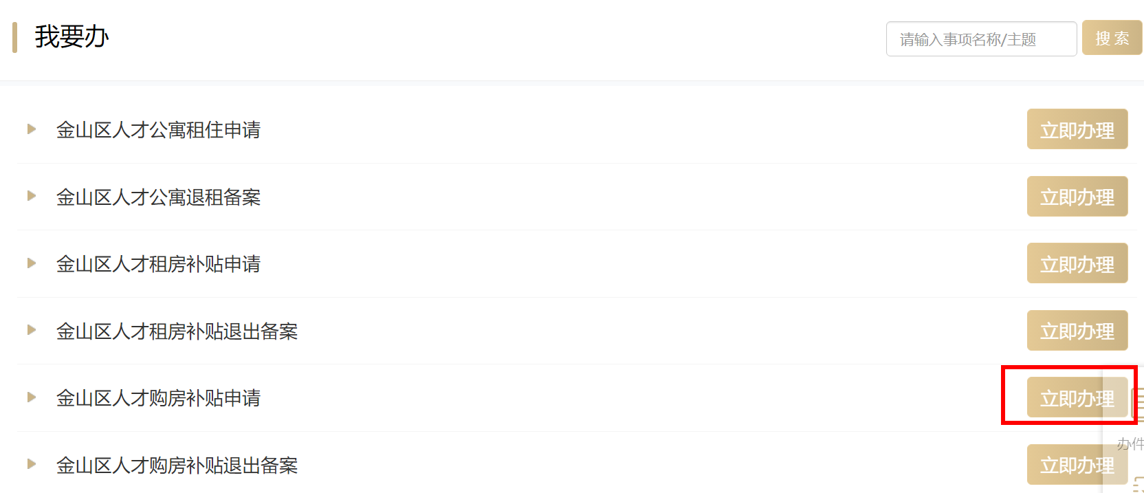 浏览办理事项,选择“金山区人才购房补贴申请”,点击“立即办理”