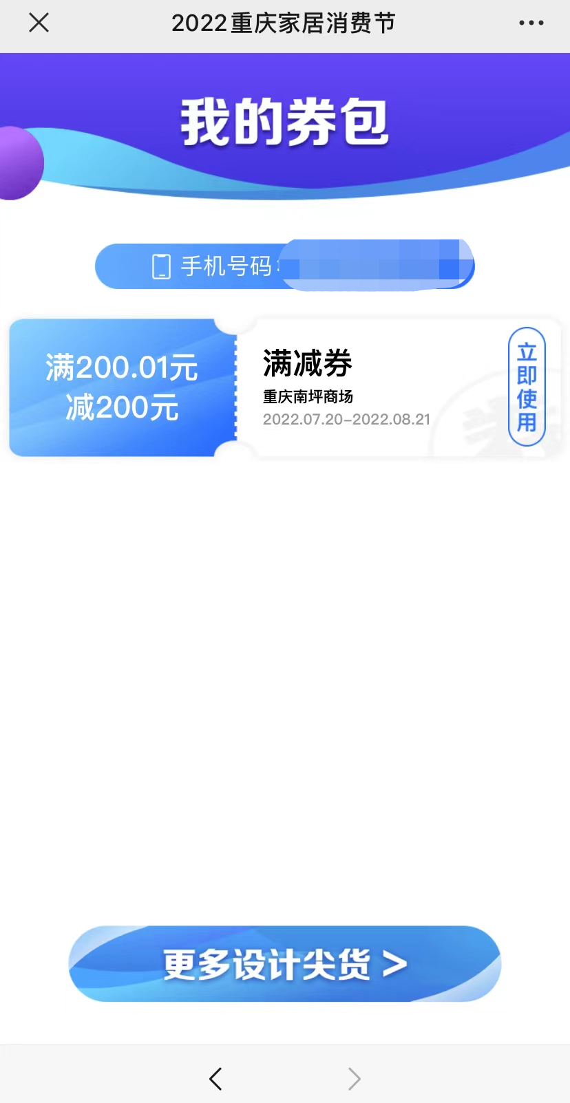“2022重庆家居欢乐购”系列活动之一的“百万家居消费券”派送近日启动,所发放的消费券为无门槛消费券,每张面值200元,快来参与领取吧!活动期间,市民领取消费券后,可到红星美凯龙西南全球家居1号店、重庆至尊MALL、南坪商场、二郎商场、茶园商场的600多个品牌门店,购买正价商品。