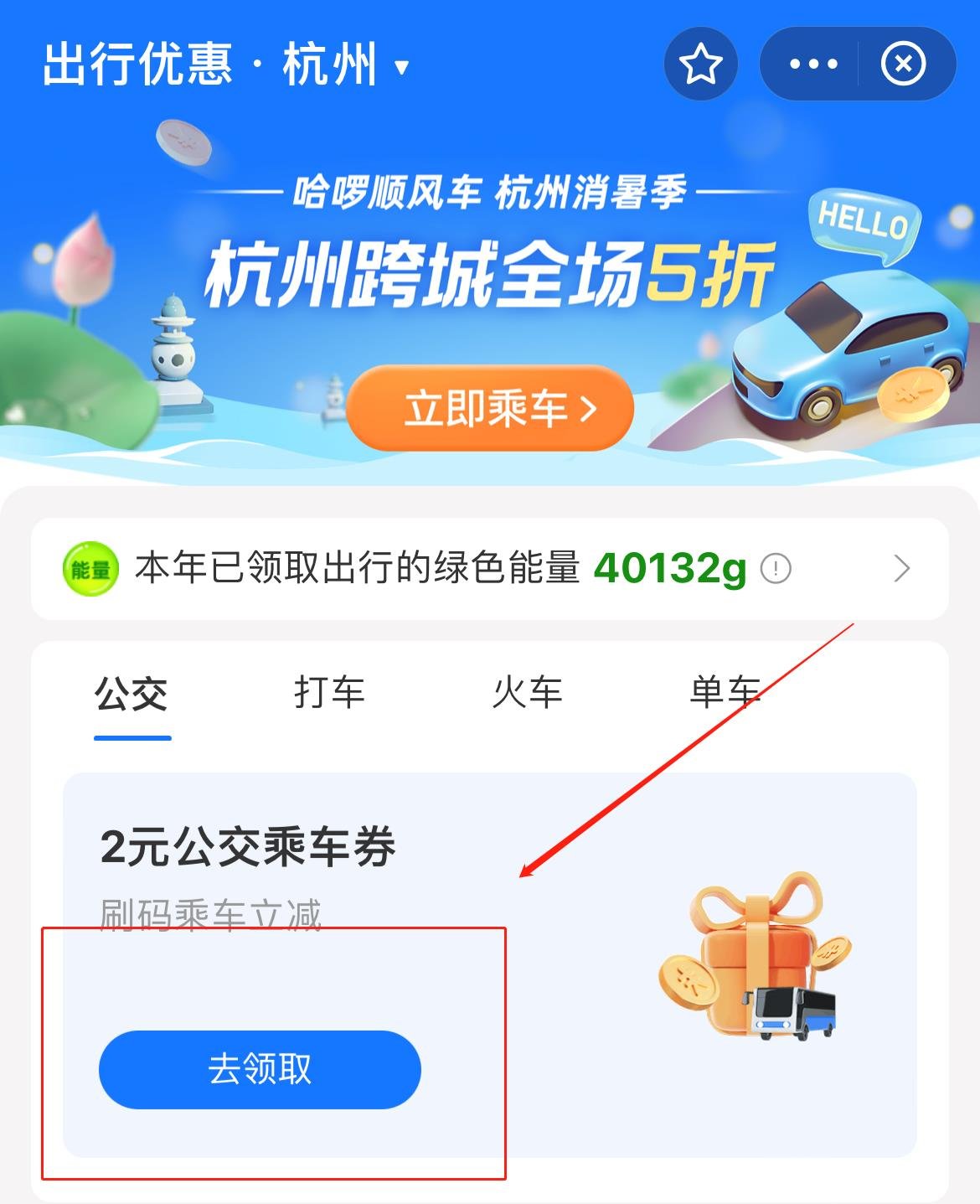 第二步:点击2元公交乘车券页面中的“去领取”。