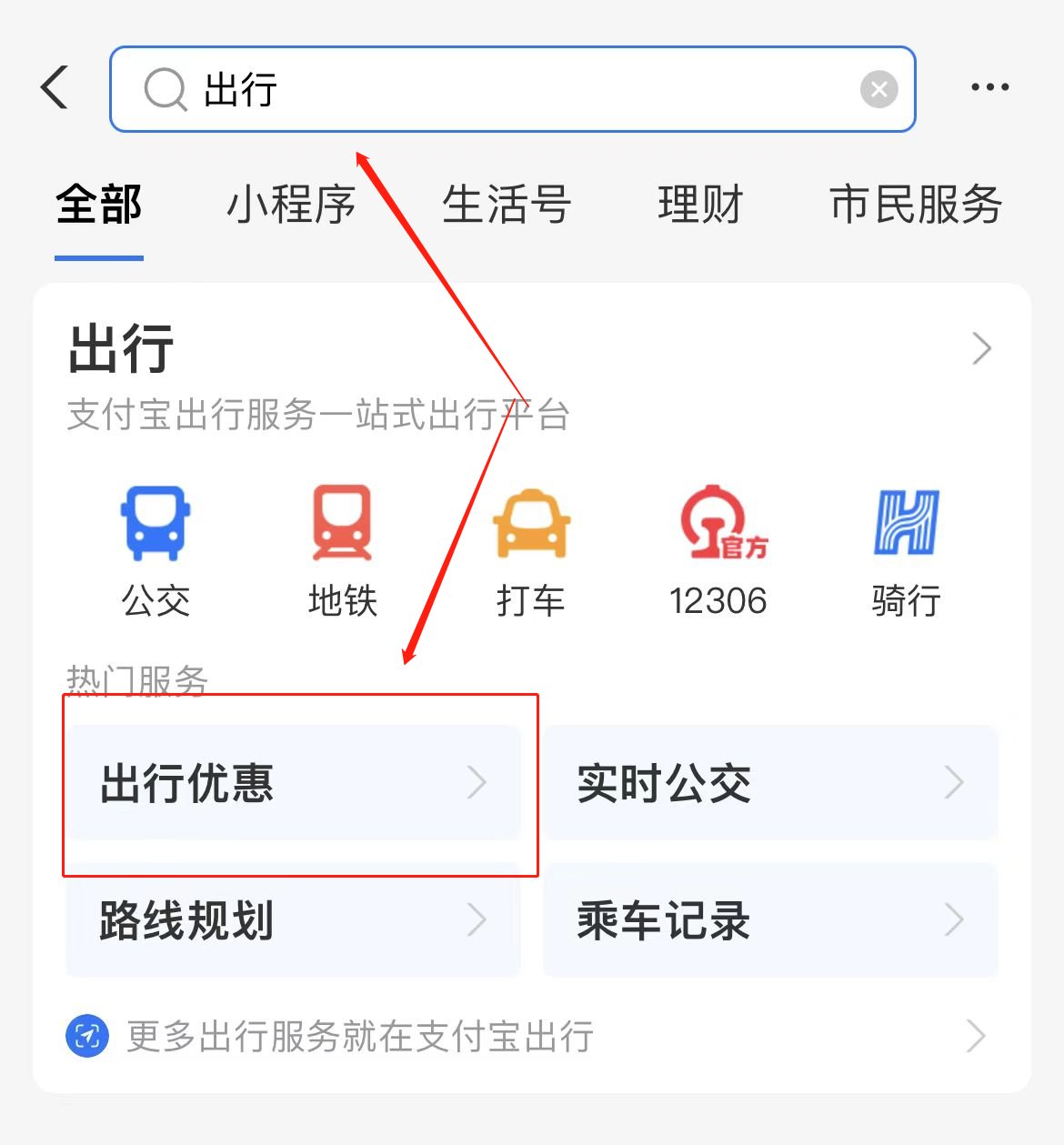 第一步:打开支付宝App,在首页搜索框上搜索“出行”,点击图片中的“出行优惠”,进入领券页面。