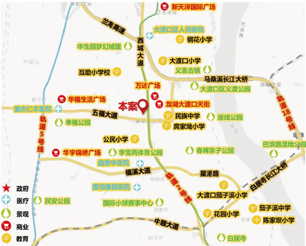 交通:五福大道、福溪大道、西城大道、星港路、中顺大道、白居寺长江大桥、鱼洞长江大桥等主干道网;轨道2号线已全线运营,轨道5号线部分通车,18号线预计2023年建成通车。