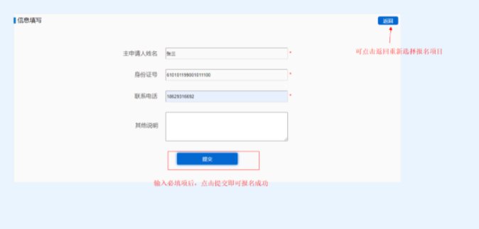 第5步:进入信息填写页面,输入姓名、身份证号、联系电话(必填项)、其他说明(选择性填写),点击【提交】即可报名成功。也可点击【返回】重新选择报名项目,如图。