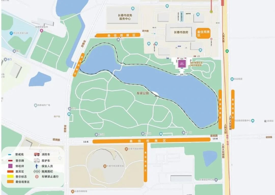 受无人机飞行表演飞行高度、观看距离等因素影响,最佳观赏地点为:友谊公园东侧人民大街两侧辅路;友谊公园南侧谊民路沿线;长春规划馆西侧华弘街沿线;华新街与幸福东路交汇北向150东西两侧辅路;市政府大楼东西两侧区域。