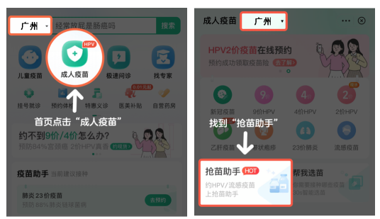 2、下载后,选择“广州”地区,点击 “成人疫苗” ,点击“抢苗助手”