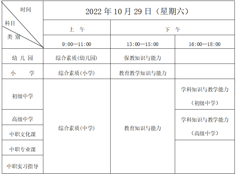 注:1.初级中学和高级中学学科知识与教学能力对应教育部课程标准中相应层次学校课程。初级中学学科知识与教学能力科目分为语文、数学、物理、化学、生物、历史、地理、道德与法治、英语、音乐、美术、体育与健康、信息技术、历史与社会、科学15个学科; 高级中学学科知识与教学能力科目分为语文、数学、物理、化学、生物、历史、地理、思想政治、英语、音乐、美术、体育与健康、信息技术、通用技术14个学科。其他学科暂不开考。