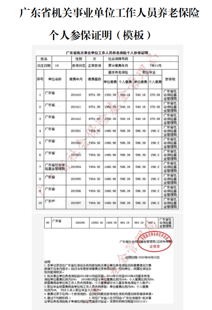 广东省机关事业单位工作人员养老保险个人参保证明(模板):