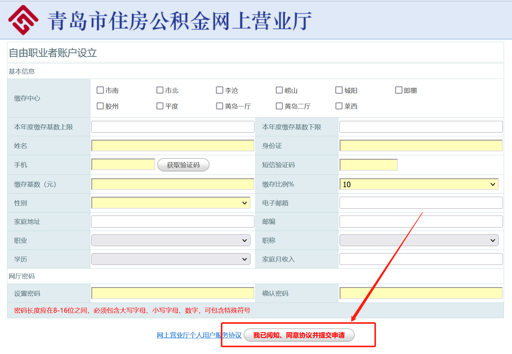 2、选择缴存中心、录入姓名、身份证、手机、短信验证码、缴存基数,选择缴存比例,设置网厅密码,最后点【我已阅知、同意协议并提交申请】,申请提交成功后,即时开通公积金账户,可以登录网厅办理个人相关的业务。