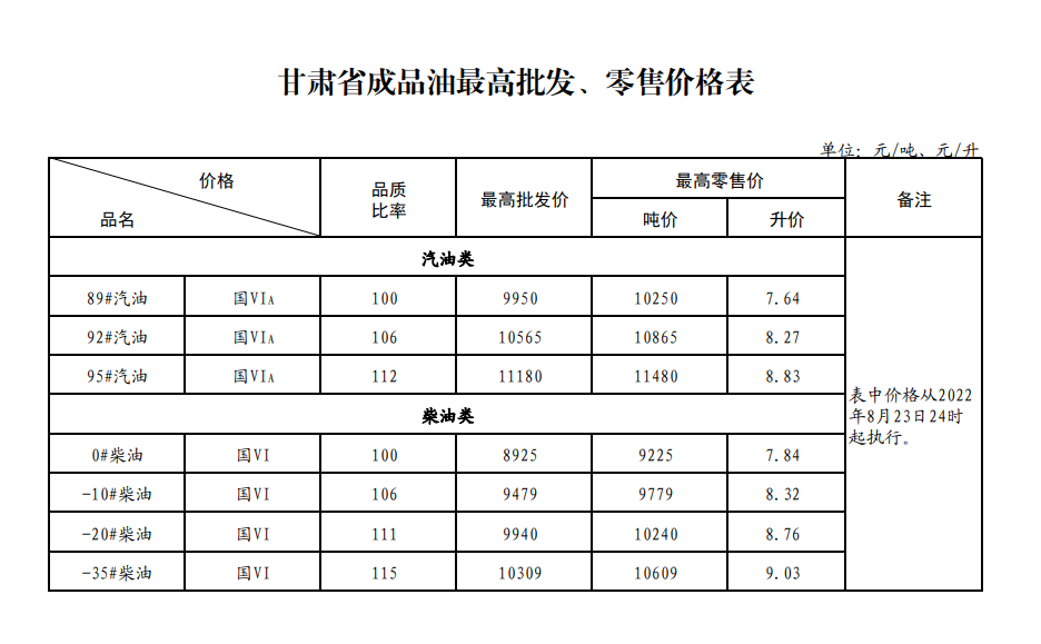 自2022年8月23日24时起,我省汽、柴油标准品价格分别下调205元和200元。调整后的各牌号汽、柴油最高批发、零售价格见附表。