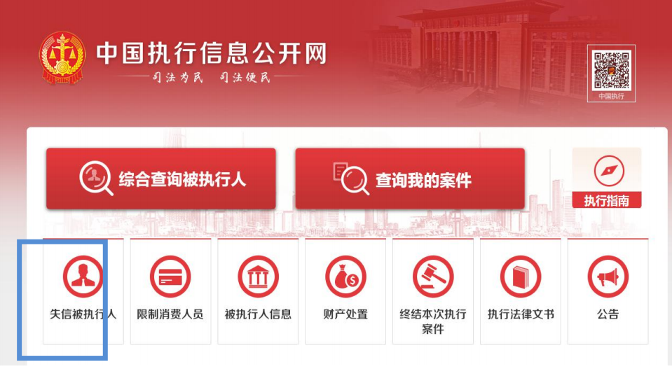 第二步:点击首页中“失信被执行人”栏目。