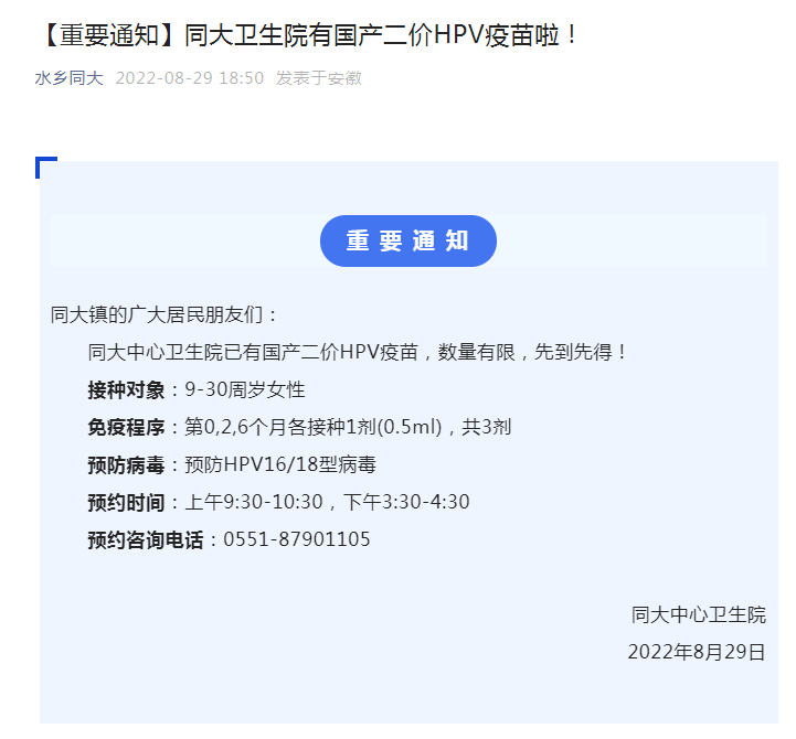 同大中心卫生院已有国产二价HPV疫苗,数量有限,先到先得!