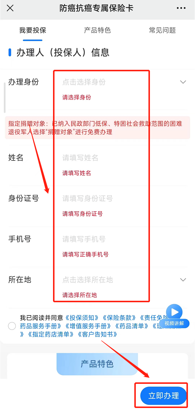 注:①符合红框内条件的退役军人,选择“捐赠对象”进行免费办理。其他退役军人及家属选择相应身份进行免费办理。其他退役军人及家属选择相应身份进行办理(投保人需填写家中退役军人信息)