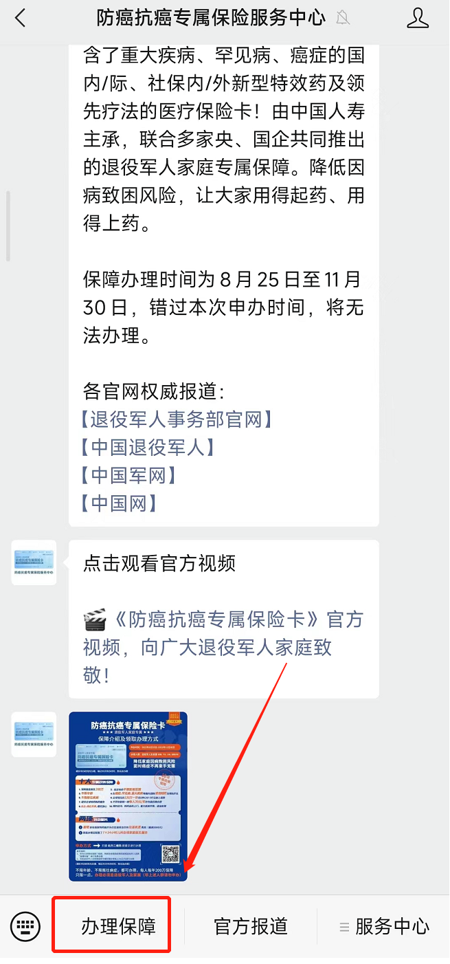 办理入口:“防癌抗癌专属保险服务中心”公众号